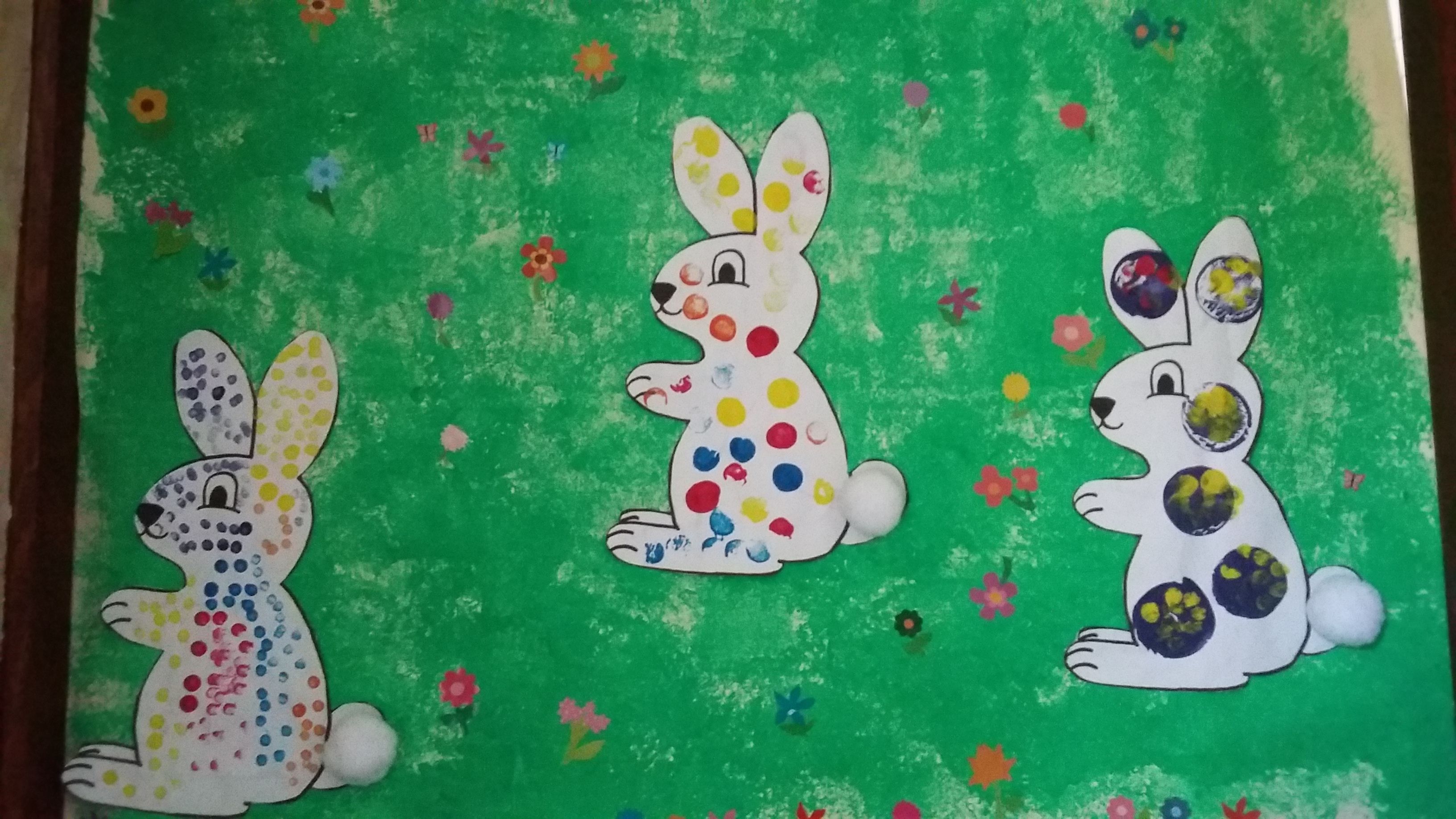 Il a peint sont premier lapin en faisant des points au coton tige, le deuxième lapin en faisant des ronds avec un bouchon en liège et le troisième lapin faire la même chose avec un gros bouchon en plastique (pas pratique). Dans les empreintes des gros bouchons, il devait faire des empreintes de doigts.